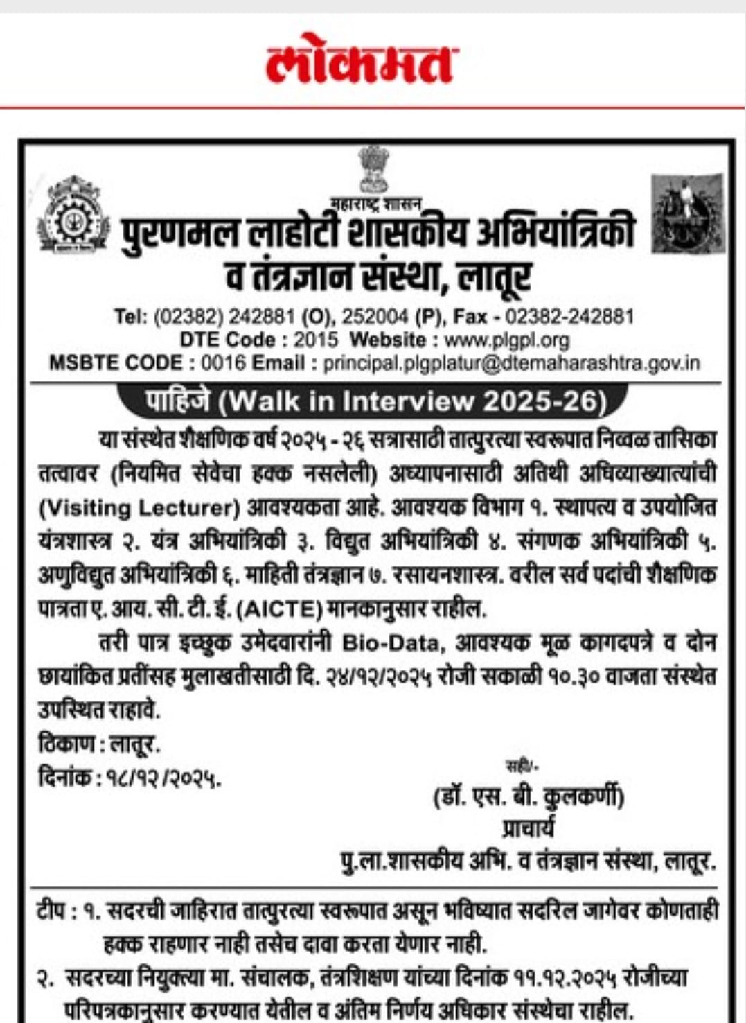 Principal, Puranmal Lahoti Govt.Polytechnic, Latur